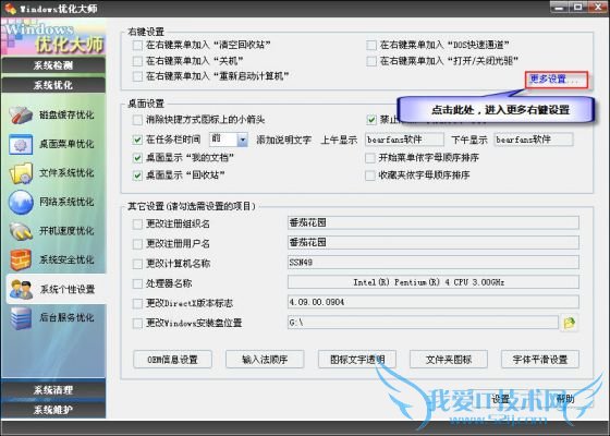更改DirectX版本标志。许多用户在安装了高版本的DirectX后发现自己对新版本的DirectX不满意想要重新安装低版本的DirectX时,发现DirectX安装程序报告当前的系统已经安装了更高版本而拒绝进行下去。现在你可以通过修改DirectX的版本号来欺骗DirectX的安装程序。例如:如果您已经安装了DirectX 9,现在想要重新安装DirectX 8,那么最简单的方式是在Windows优化大师的个性化设置中将DirectX版本标志4.09…中的第三个数字从9改为7,然后单击“设置”按钮即可开始安装DirectX 8了。