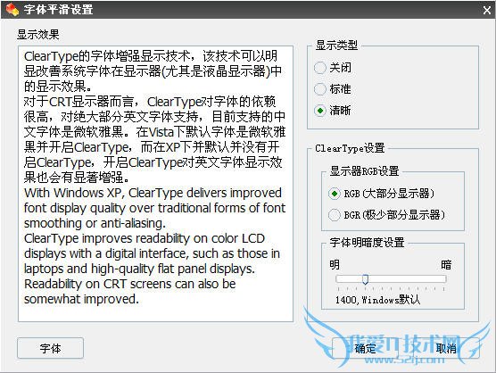 字体平滑设置,您可以设置显示类型、ClearType设置(显示器RGB设置和字体明暗度设置),设置完成后点击“确定”保存设置。