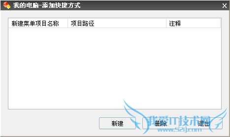 点击“新建”,新建菜单项目;点击“删除”,删除已有的菜单项目;点击“退出”,退出“我的电脑-添加快捷方式”,退回到Windows优化大师。