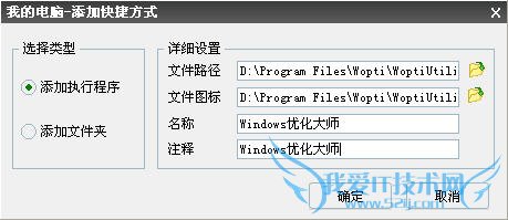首先,您需要选择添加快捷方式的类型(执行程序或文件夹);选择好相应的路径,优化大师将给出相应的图标参考,您可以根据自己的需要更改图标;也可以添加上显示的名称以及注释。