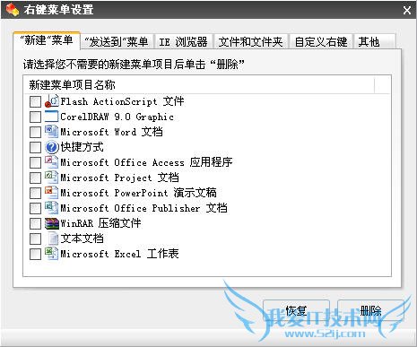 点击“更多设置”按钮进入右键菜单的设置窗口,用户可在此整理和设置更多的鼠标右键菜单,包括:“新建菜单”;“发送到菜单”;“IE浏览器工具菜单”;“文件、目录、文件夹、驱动器菜单”,“其他”等。