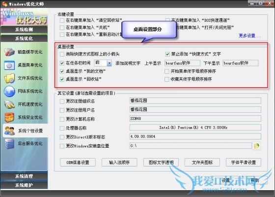 该组设置选项的主要功能是设置与桌面相关的项目。包括消除桌面快捷方式图标上的小箭头;在创建快捷方式时禁止添加“快捷方式”文字信息;在任务栏的时间前或后面添加文字说明;桌面显示“我的文档”(备注:在Vista下,此处为桌面显示“用户的文件”)、桌面显示“回收站”等项目。