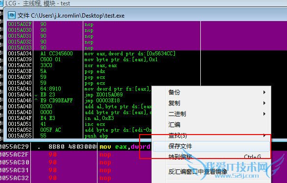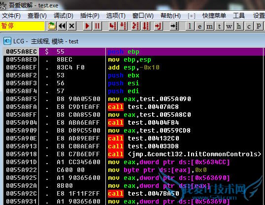 3秒之后界面消失,语句执行到下一行了,上面这个call test.00557228就是要找的,call后面是什么每个人都不一样,但就是这个call调出了这个闪屏界面。双击它,在弹出的对话框中写入nop,点击汇编,再关掉该对话框即可。