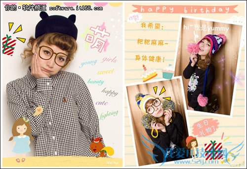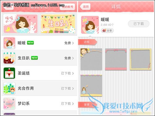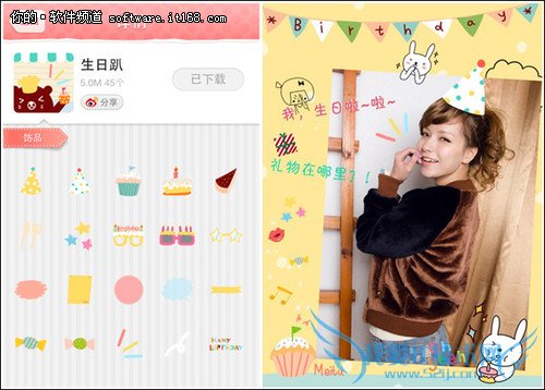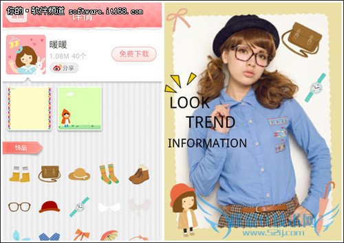 点击首页“素材中心”即可预览新增的两大主题素材,分别为小女生“暖暖”的时尚美饰素材;和可以表达生日祝福的可爱“生日趴”素材,点击相应的主题素材即可预览,建议wifi下载省省流量也是好的哟!