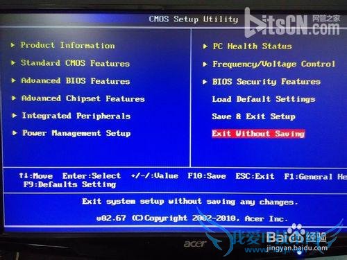 5、然后,按键Esc退回到BIOS主页面,通过上下键,选择“Exit Without Saving”。