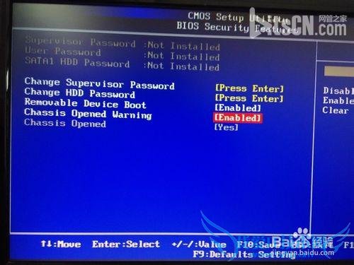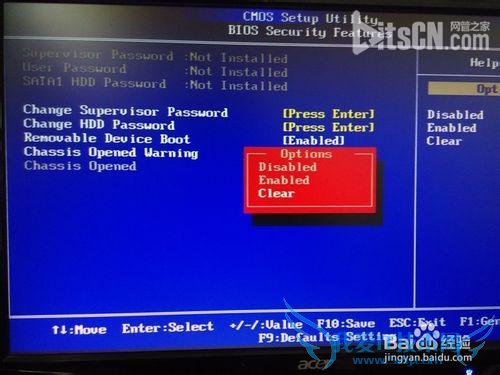 4、之后,选择到Enabled”状态上,点击回车键。会出现Enabled、Disabled 、Clear三个选项。选择Disabled为禁止此提示,也就是以后开机后不会再提示。选择“Clear”为清除,以后开机还是会提示。大家可以根据自己的需求来选择。一般选择“Clear”就行了。“Enable”为开启状态。在此选择“Disabled”状态。