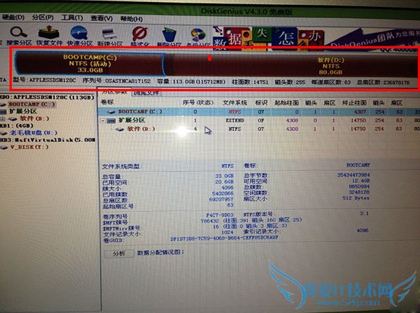 根据你自己的需要对硬盘进行分区,格式建议还是选择NTFS格式,以后会省去很多的麻烦!由于我的是120的AIR,所以我只是分了两个区,一个33,一个80,如果你是500的MACBOOK PRO,那就可以多分两个区了。