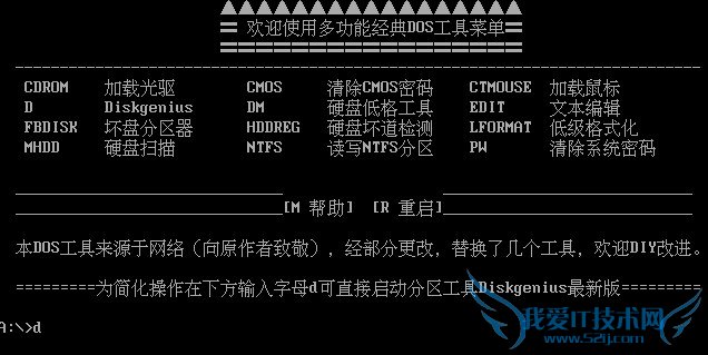 2、强大的分区工具Diskgenius 3.5.0最新版:启动后是一个小的DOS工具集合,为简便起见直接输入d回车即可启动Diskgenius,当然也可选择启动其它dos工具。