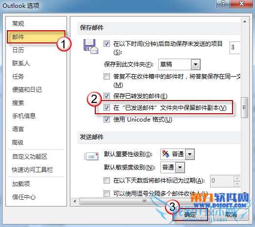 在选项窗口左侧单击“邮件”,从右侧细节窗口中找到并勾选“在已发送邮件文件夹中保留邮件副本”。