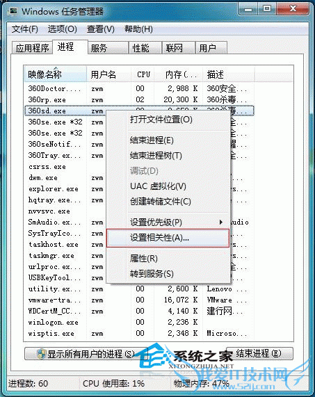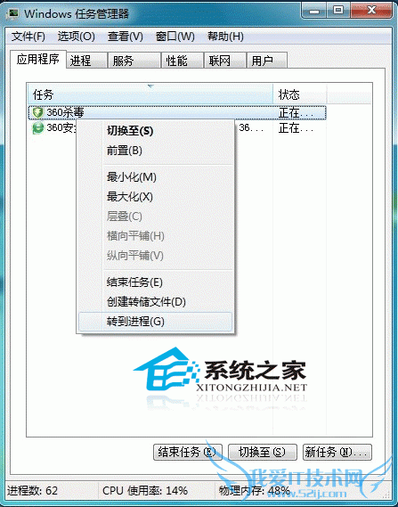 CTRL+Alt+Delete打开任务管理器,选择应用程序选项,左键点击想要设置的应用程序——右键——转到进程,你就会进入进程选项界面。