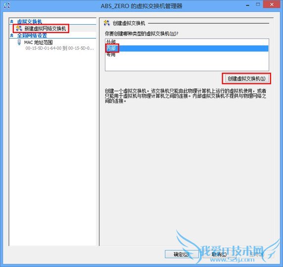 在弹出的对话框中“新建虚拟网络交换机”,选择“内部”,点击“创建虚拟交换机”。