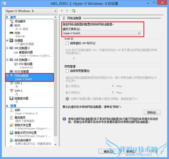 接下来,进入到Hyper-V虚拟机设置界面,在“硬件”下的“网络适配器”中,设置“虚拟交换机”为刚刚设置好的Hyper-V Switch虚拟交换机,点击“确定”。
