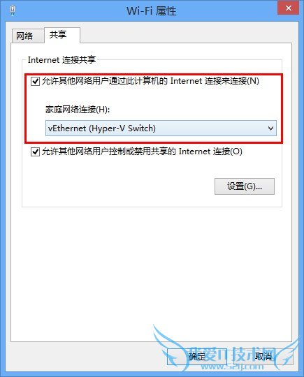 切换到“共享”标签下,勾选“允许其他网络用户通过此计算机的Internet连接来连接”并在下方“家庭网络连接”中选择刚刚创建的虚拟交换机——vEthernet (Hyper-V Switch),点击“确定”。