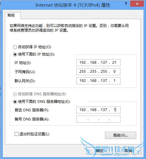 若使用手动设置,则设置IP地址为“192.167.137.X”,X为2~255任意数字,子网掩码为“255.255.255.0”,默认网关为 “192.168.137.1”,DNS服务器设置为“192.168.137.1”。注意此处的网关与DNS服务器为微软默认,没有需要请勿更改。
