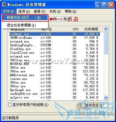 1、点击“任务管理器”菜单中的“文件”,选择“新建任务”项。
