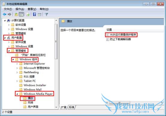 2.打开本地组策略编辑器后,从左边栏目依次进入“用户配置” — “管理模块” — “windows组件” — “windows media player” — “播放”,双击右边栏目中的“允许运行屏幕保护程序”