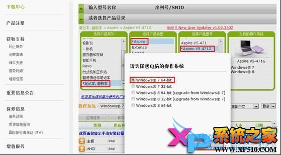 之后选择自己的电脑型号,以V5-471G为例,产品目录中选择笔记本,超级本,产品类型中选择Aspire,产品型号中选择V5-471G,之后选择目前正在使用的操作系统,点击确认,就能看到Acer官网提供的驱动程序;
