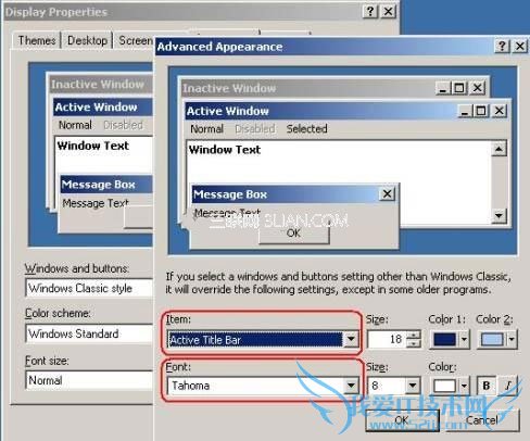 (2)在Advanced Appearance(高级外观)中,朋友们可以按照自己的偏好,将下列的Items(项目)和Fonts(字体)进行设置。英文版操作系统设置的字体是Tahoma,不太常见,大家可以更改为Times New Roman、MingLiU、Microsoft Sans Serif等。