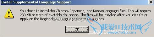 (3)当勾选了此项后,系统会询问你:"你现在选择了安装中文、日文和韩文的文件,这需要230兆或更多的硬盘空间,如果您选择OK,就会安装",这是只要点击"OK"即可。