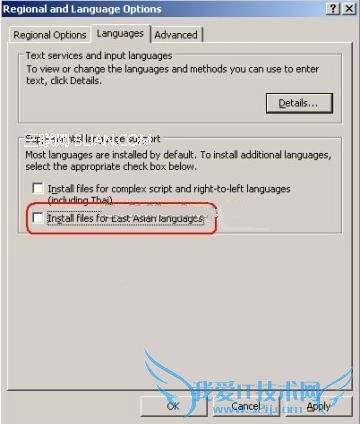 (2)在Regional and Language Options对话框中选择Lanauages(语言)标签页,并选择Supplemental language support(附加语言支持)中选上Install for East languages(为东亚语言安装文件),如下图所示: