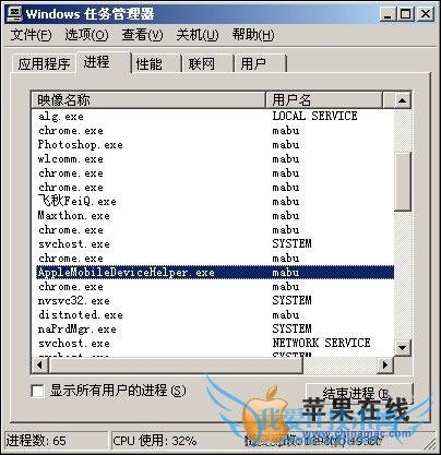 替换前注意备份iTunesMobileDevice.dll文件。如果文件无法替换,说明那是iTunes的后台服务还在运行,用任务管理器关闭ituneshelper.exe和下图中的进程就可解决问题。