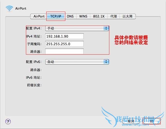2. DHCP, 电脑自动获取IP地址等网络参数。进入“AirPort”网络参数设置页面,选择“TCP/IP”,进入IP地址设置界面,如下图所示。