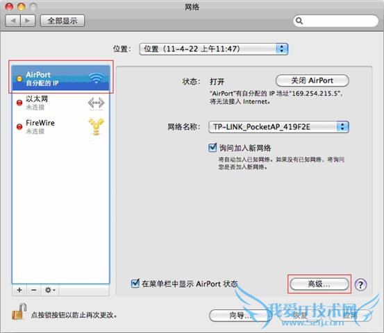 步骤3:选择需要设置IP地址的网卡(本例中以无线网卡为例)。选择“AirPort”,接着点击“高级”,进入“AirPort”网络参数设置页面。选择“TCP/IP”,进入IP地址设置界面,如下图所示。