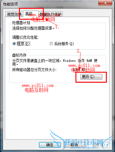 第3步:在打开的性能选项窗口中单击【高级】选项卡,并单击高级选项卡中虚拟内存下的【更改】按扭。