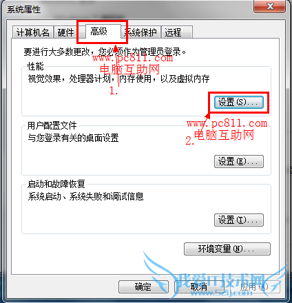 第2步:在打开的【系统属性】程序窗口中单击高级选项卡,并在高级选项卡中找到性能下面的【设置】按扭。