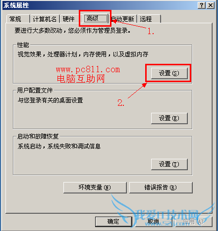 第2步:之后剩下的操作方法及步骤就完全和XP系统差不多的,在打开的系统属性窗口中的默认【高级】选项卡中单击性能下的【设置】按扭。