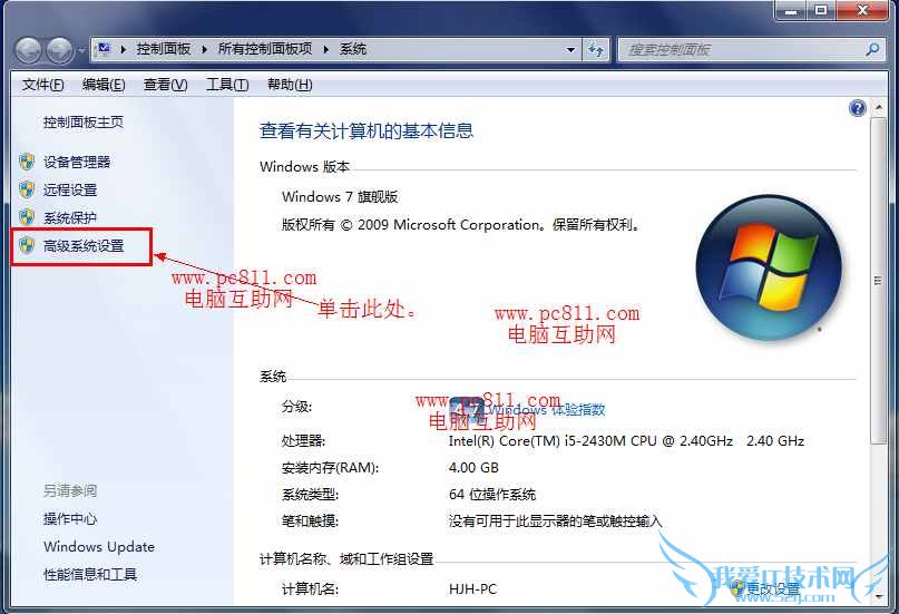 第1步:直接在WIN7系统桌面上找到【计算机】图标,并在此图标上右键选择属性,即可打开系统程序,并在打开的系统程序窗口中单击左侧的【高级系统设置】。