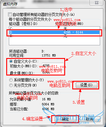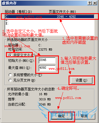 第4步:在新打开的【虚拟内存】窗口中,单击选中驱动器中需要设置的驱动器,然后再单击【自定义大小(C)】,这时下面初始大小和最大值后面的文本框即可输入,初始大小和最大值输入自己需要设置的数字,然后单击【设置】按扭,最后并确定即可生效。
