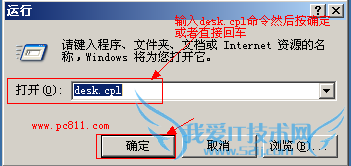 第1步:单击开始菜单中的运行,在打开的运行窗口中键入【desk.cpl】并确定打开【显示属性】窗口。