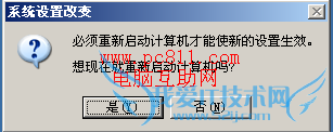 第5步:按本文所说的第1到第4步设置完毕之后,并一次次的确定之后。这时因为系统设置改变,系统就会提示“必须重新启动计算机才能使新的设置生效。”,选择是电脑重启之后即可生效。生效之后虚拟内存所设置的根目录中的隐藏文件pagefile.sys就会出现相关大小的改变。