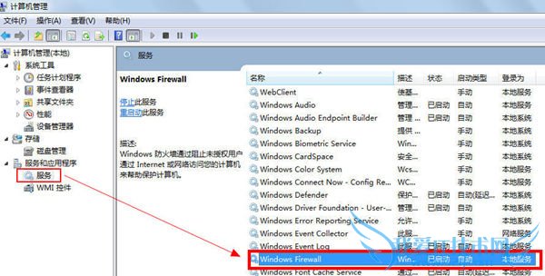 3. 在出现的服务列表中找到 windows firewall 选择启用即可。