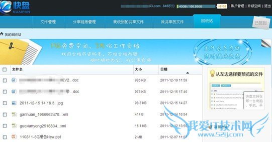 2、网页版快盘“回收站”中的文件也是占用户快盘空间的,所以如果用户快盘空间满了,回收站也是无法保存文件的。这个时候我们可以从回收站中删除确实不需要的文件。可以选中这些文件,再单击上方的“删除”按钮即可将它们彻底删除掉。