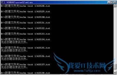 在FAT32文件格式的硬盘中双击这个批处理文件后,再耐性等待一会儿,我们发现在建立到第65535个文件时,出现“无法创建目录或文件”的提示了,这说明在FAT32文件格式下一个文件夹下面最多能放65535个文件。