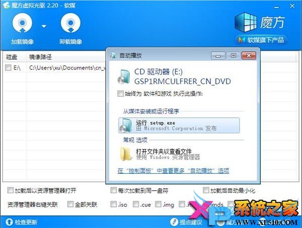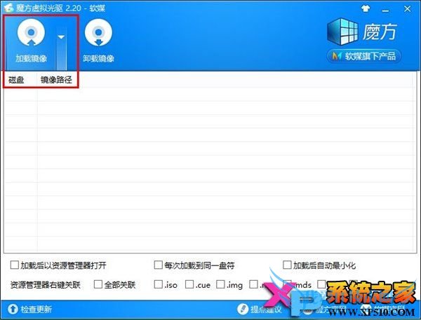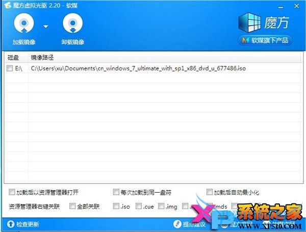 2、在魔方虚拟光驱中,点击加载镜像,就可以像使用光盘一样使用虚拟光驱了。如下图所示,魔方虚拟光驱支持.iso.cue.img.mds等格式的镜像文件。