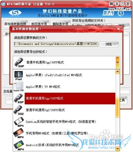 导入要转换的WMV视频后,即可进入如下的“基本转换参数选择”对话框,这款软件不但支持导出手机常用的3GP/MP4/AVI等格式,还提供符合各硬件的官方标准规范的MP4格式,如iphone、ipad、PSV、Android系统、魅族等硬件的MP4格式,面面俱到中体会到了它的专业。