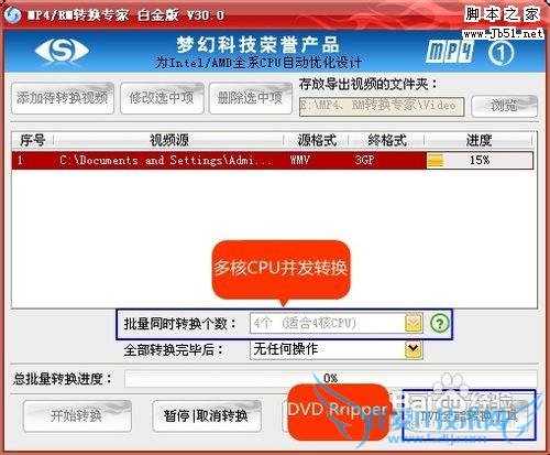 设置如上的各参数后,点击“确认”按钮即可回到主界面进行极速转换。这款软件最先开发并使用了多核CPU并发转换技术,最高支持到16核心优化,是业界转换速度最快的软件,无论是单个转换还是多个并发转换,都能快速完成。另外,它还自带一款《DVD全能转换》工具,支持将DVD光盘按标题、章节转换成3GP、MP4等视频格式,以在手机等移动硬件上观赏。|