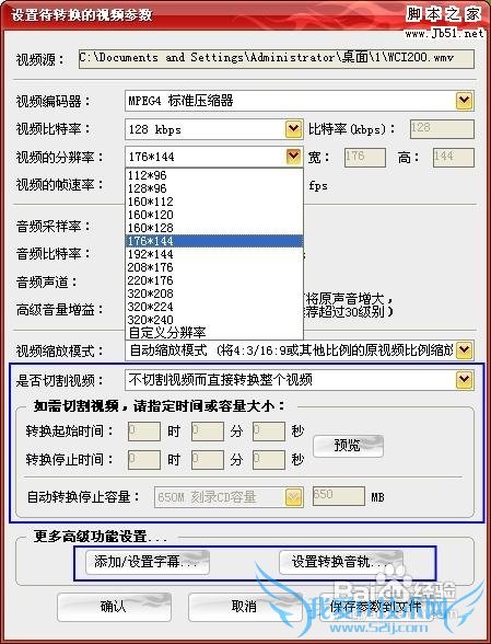 选择适合自己手机的3GP格式后,将弹出如下对话框。如果不需要对视频进行其他的设置,直接保持软件默认的一切参数即可。如果比较熟悉自己手机的配置,机油们可以尝试调节视频的比特率、分辨率以达到自己的要求,一般来说设置的视频比特率越高,质量越好,体积也越大。所以大家可根据自己的需求慢慢调节,以达到自己满意的效果。