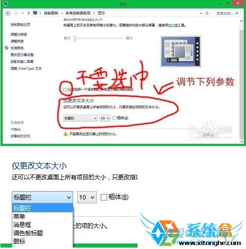 3、在弹出的窗口 把“让我选择一个合适我所有显示器的缩放级别复选框” 不要勾选,单击应用 然后————更改下列参数,把下面的标题栏和其他下拉中的各项 更改为字号10 更改一个 单击一下应用。