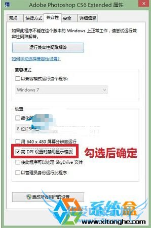 2、在软件属性界面,点击“兼容性”选项卡,在设置下面,点击勾选“高DPI设置时禁用显示缩放”后,点击底部“确定”按钮,退出设置界面即可。
