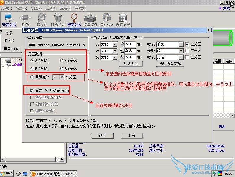 第六步:选择所需要分区的数目或手动选择硬盘分区数目,并“重建引导记录”保持不变