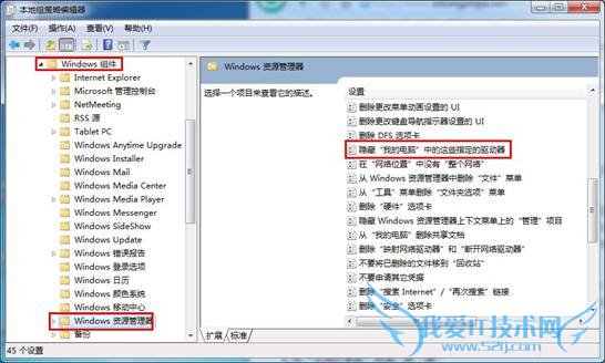 2、在打开的组策略编辑器中,我们依次展开“本地计算机策略→用户配置→管理模板→Windows组件→Windows资源管理器”,接着在右边窗格中找到并双击“隐藏‘我的电脑’中的这些指定的驱动器”打开设置窗口,如下图所示: