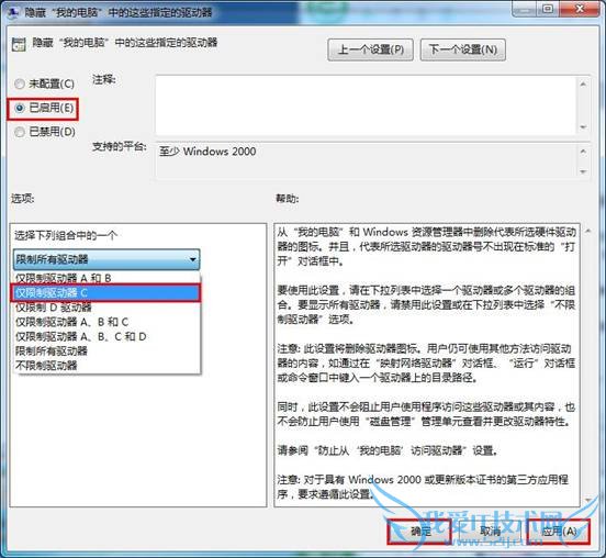 3、在属性设置窗口中,我们只需点击“已启用“,并在驱动器下拉列表中选择需要隐藏的磁盘,点击”应用—确定“按钮保存修改即可,如下图所示: