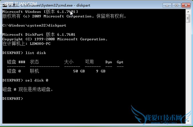 注3:sel disk 0 选中磁盘0(全称select disk 0)