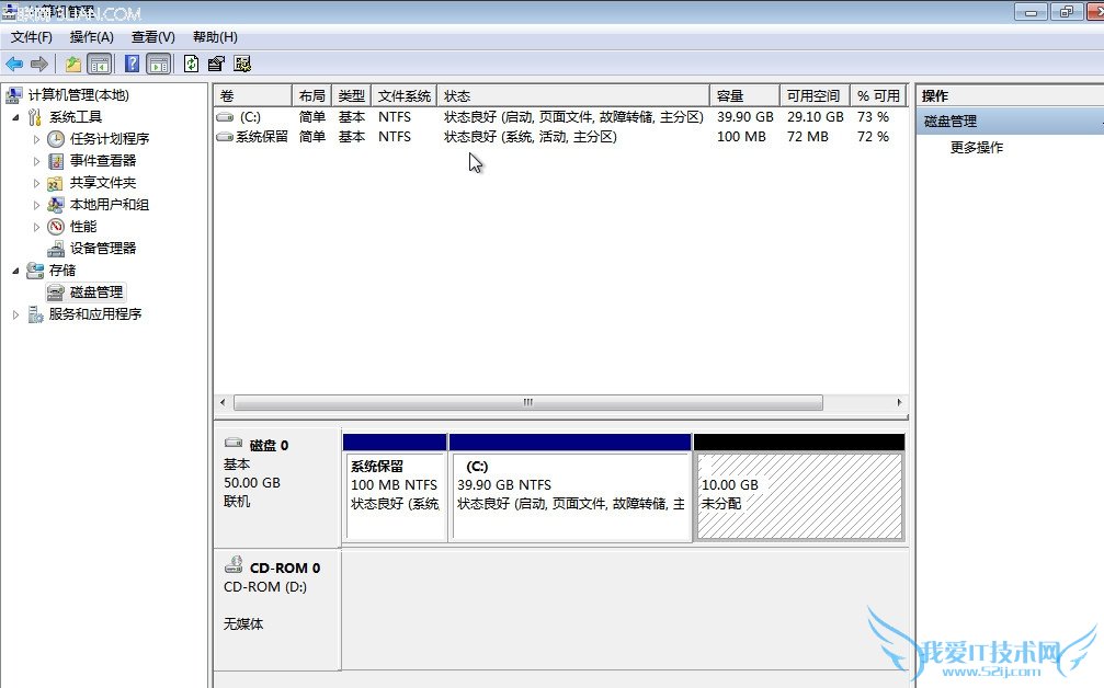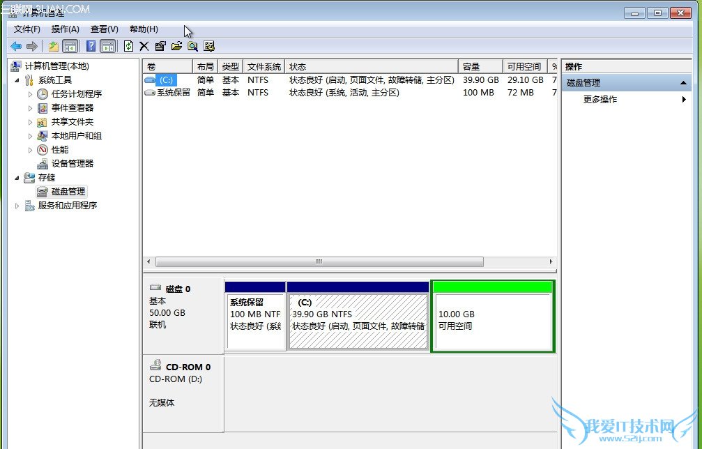 磁盘管理中,可以看到刚才的10G分区已经变成绿色,证明扩展分区已经创建成功,如图