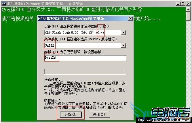 4、这里为您的U盘选择文件系统(一般选FAT32兼容性好点)和卷标(天缘输入的是BootXp),并然后点“开始”,如下图。
