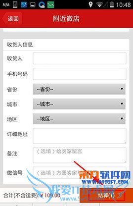 2)然后在购物车上输入收货人的信息,姓名、手机号码、地址、还有需要的留言备注。输入完成之后点击【结算】,就可以购买商品了。